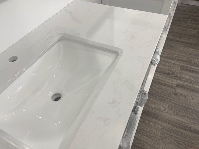 Our products are crafted to achieve a luxurious, high-end finish. All of our vanities come with an engineered stone countertop, featuring a white base with subtle light grey veining throughout. This design detail adds a touch of elegance and sophistication to any space. Please refer to the image for a visual reference here. https://44674976.fs1.hubspotusercontent-na1.net/hubfs/44674976/Engineered%20Stone%20Top-2.jpg